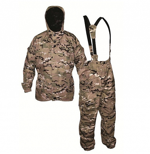 Особенности модели: – регулируемый капюшон с козырьком и утяжкой с фиксатором – пуговицы (НАТО) для надежности крепления пропущены через киперную ленту – два кармана с клапаном на пуговицах внизу – на каждом рукаве по одному карману, с клапаном на липучке – внутренний карман из основной ткани – резинка в области предплечья для лучшего прилегания к руке – манжеты рукавов стягиваются резинкой – утяжка по низу куртки Брюки Особенности модели: – брюки с широким поясом на резинке со шлевками под ремень – два кармана сзади закрыты клапаном на пуговице – два кармана прорезных сбоку, два накладных объемных с боку в области колена с клапаном на пуговице – брюки имеют отстегивающиеся помочи с широкой резинкой (50мм.) – брюки по низу стягиваются резинкой – резинка в области голени для лучшего прилегания к ноге – внутри по низу «пыльник» из ткани бязь (100% х/б)